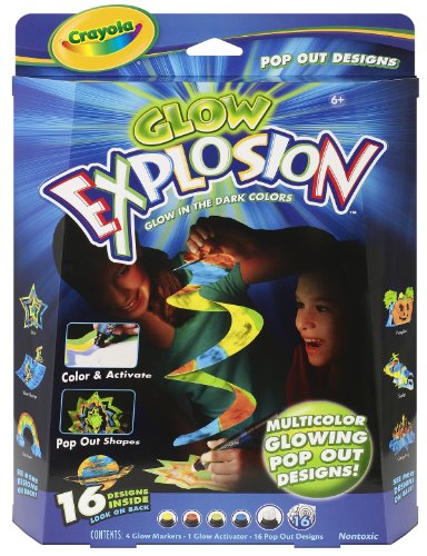 Glow Explosion Pop Out Designs Kit. Glow Explosion markers and paper offer a revolutionary new way to color! Create awesome colors on special paper and use the glow activator to supercharge your art-make it glow in the dark for up to 4 hours! It's like coloring with glow sticks! This kit features pop-out designs that you color and then pop-out to make multi-dimensional works of art. This package contains four glow markers in assorted colors, 1 glow activator markers, and sixteen paper pop out designs. Non-toxic and conforms to ASTM D4236. Recommended for ages 6 and up. WARNING: CHOKING HAZARD-Small Parts. Not for children under 3 years. Made in USA/Imported.