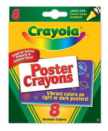 Create vivid posters in a rainbow of brilliant hues on light or dark poster paper with Crayola Poster Crayons. These eight vibrant-colored crayons are perfect for making broad sweeps of color. Use them for school projects, science fairs... they're even great for making signs to advertise lemonade stands or bake sales! There's no end to the creative possibilities with Crayola Poster Crayons!