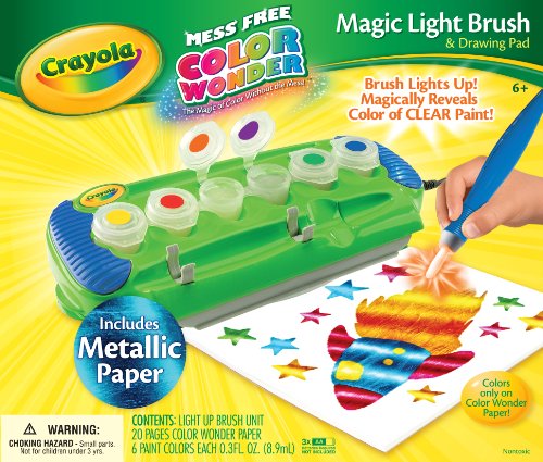 It's Magical! Mess-Free paintbrush that magically lights up in the color of each clear Color Wonder paint! Now includes Color Wonder Metallic Paper for extra shiny metal effects! Includes : Light-Up Paint Brush Base 6 Ct Mess Free Paint Pot 10 Pages of Color Wonder Paper and 10 pages of Metallic Paper The Magic Light Brush knows what color you are using and magically reveals the color of clear Color Wonder paint! Mess-Free Color Wonder Paper is specially coated so color only appears where it should. Color Wonder products are clear, and their colors only appear on Color Wonder Paper. Color won't appear on skin, walls, carpet or clothing. All Color Wonder products work on any Color Wonder Paper.