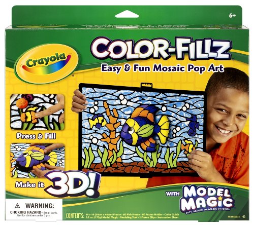 Model Magic Color Fillz Mosaic Pop Art Kit: Fish. Crayola Color Fillz has everything you need to create fun mosaic style portraits. It's easy! Just place the frame over the color guide and fill with Model Magic modeling material. This kit even includes a 3D pop-out center to fill as you wish! This kit contains eight packages of Model Magic in assorted colors, 1 color Fillz Frame, 1 color guide, 1 modeling tool, (1) 3D frame, (1) 3D frame holder, 2 frame clips, and instructions. Finished size: 16x10-1/4" x 1-1/2". All materials are non-toxic. Conforms to ASTM D 4236. WARNING: CHOKING HAZARD-Small Parts. Not for children under 3 years. Made in USA and